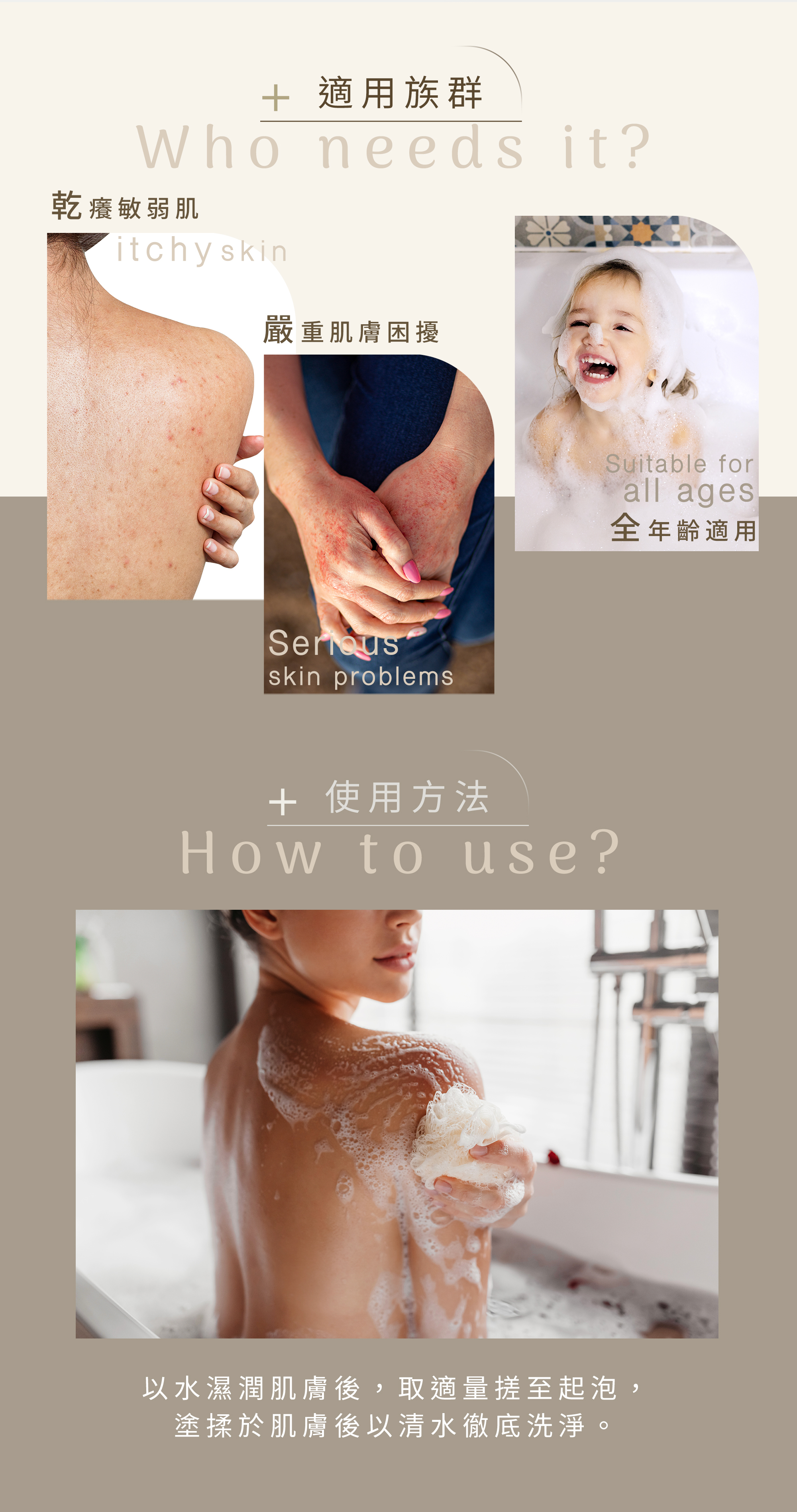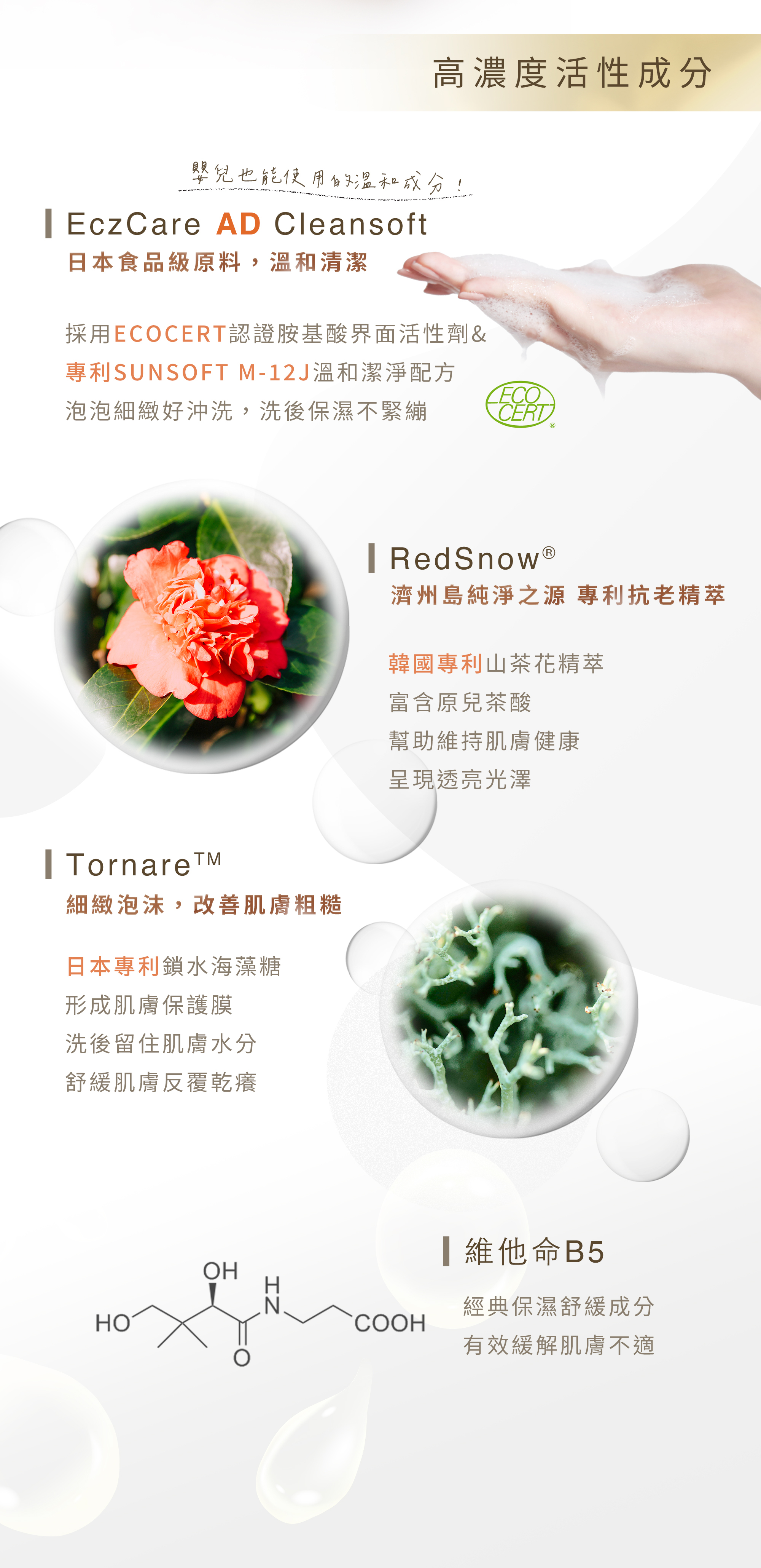 • 溫和低泡沫配方,親膚低敏,舒緩因乾燥引起的肌膚敏弱