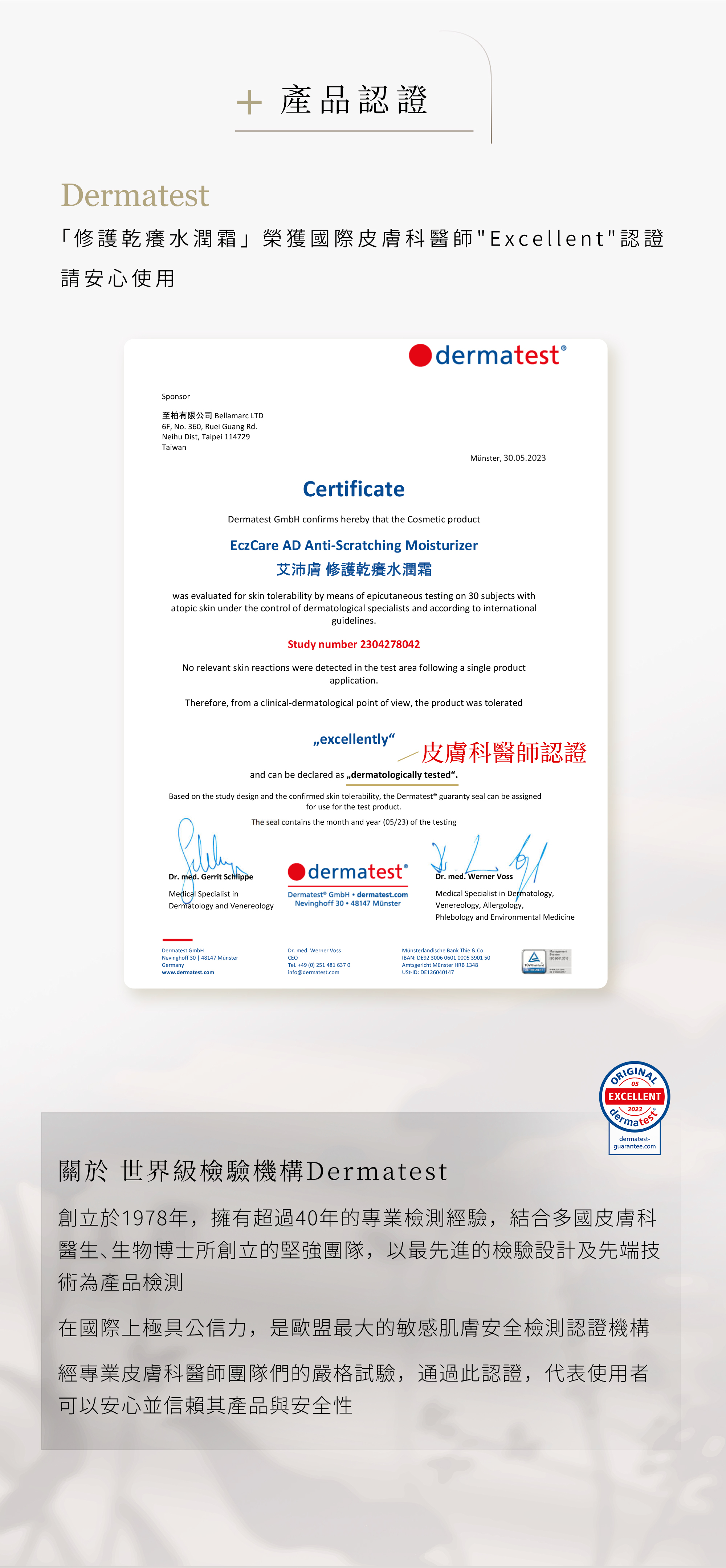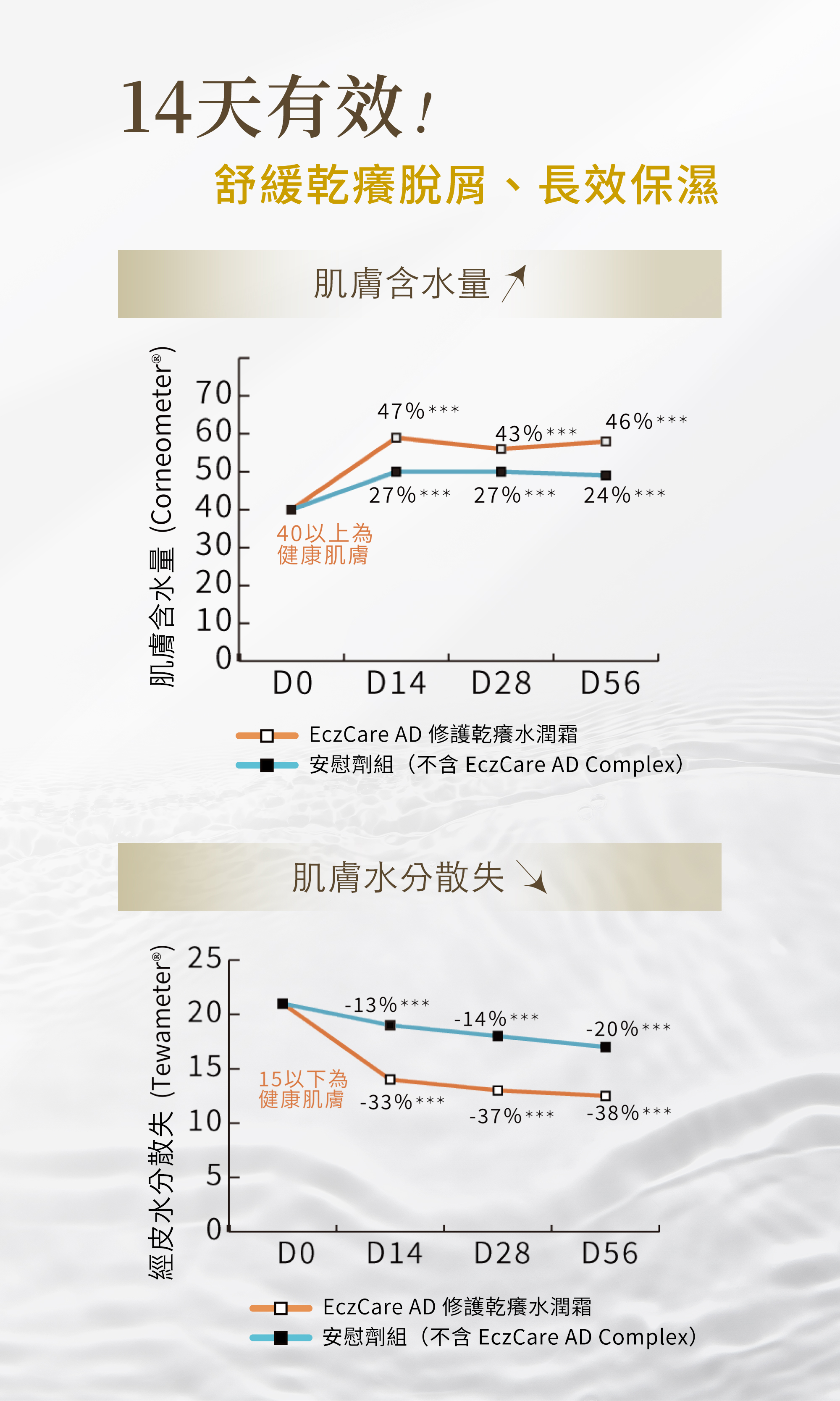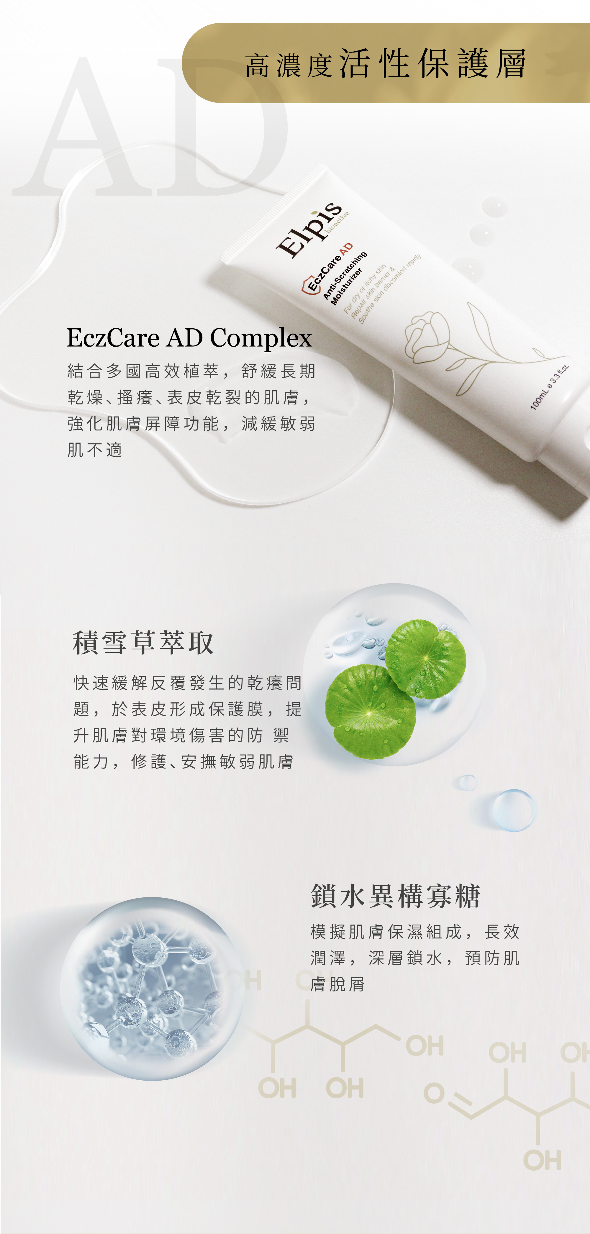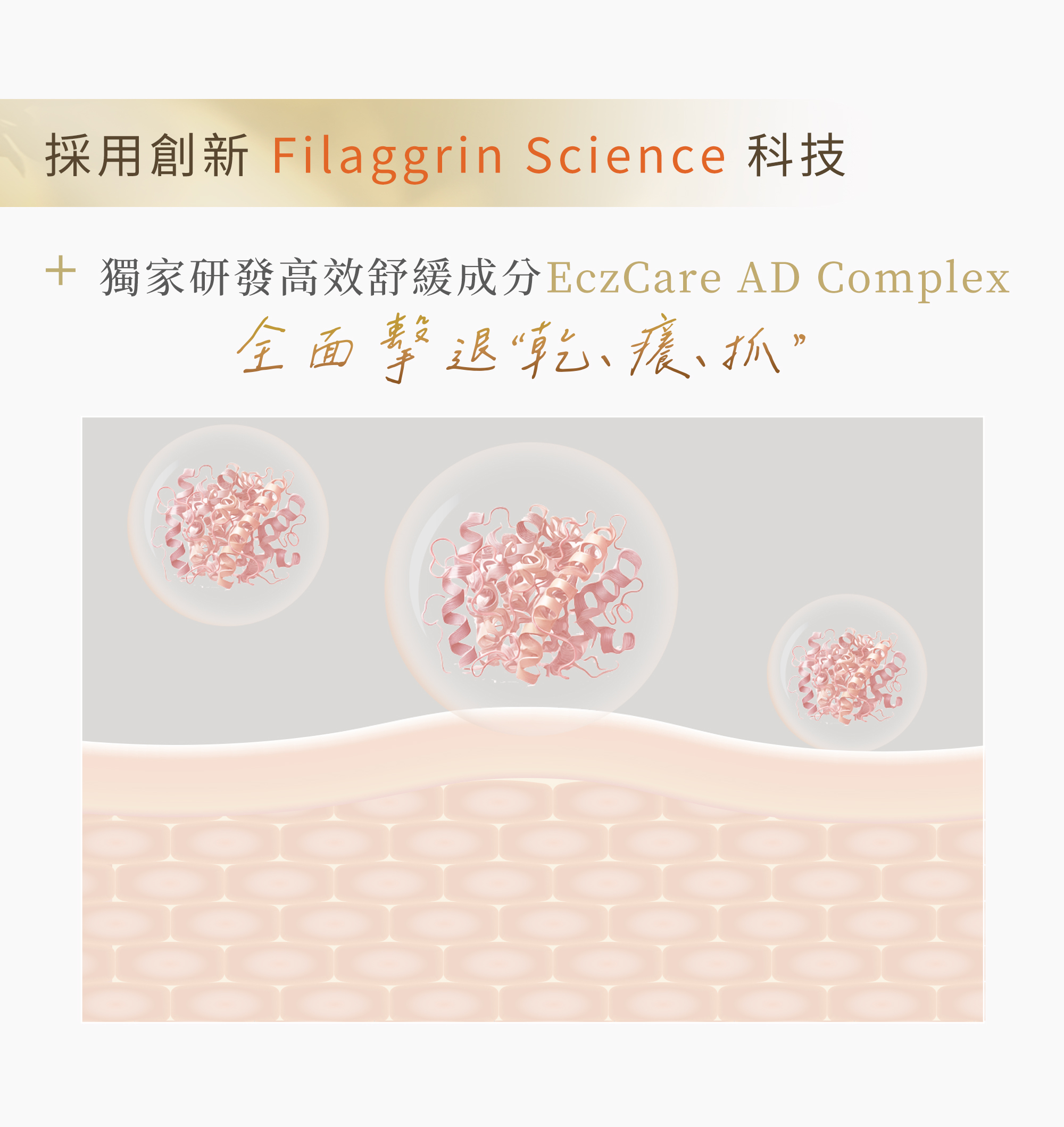 • EczCare AD Complex:結合多國高效植萃,能舒緩長期乾燥、搔癢、表皮乾裂的肌膚,並透過強化肌膚屏障功能,提高肌膚含水量,減緩敏弱肌不適,幫助肌膚維持健康與活力。