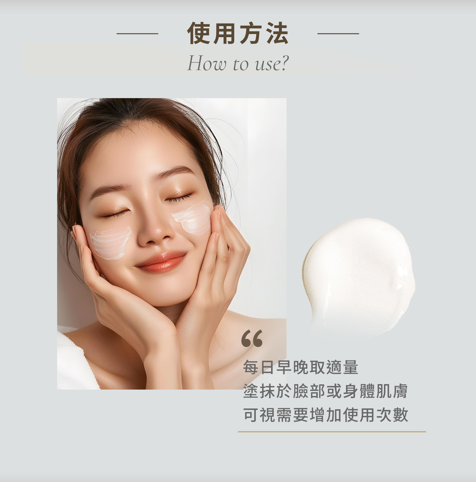 使用方法:每日早晚取適量塗抹於臉部或身體肌膚,可視需要增加使用次數