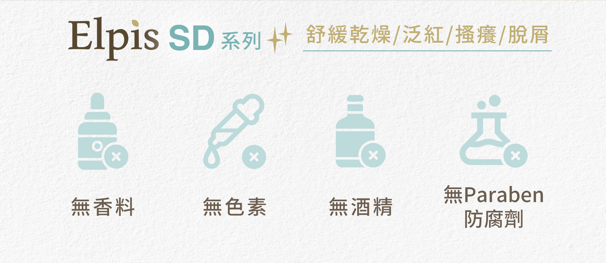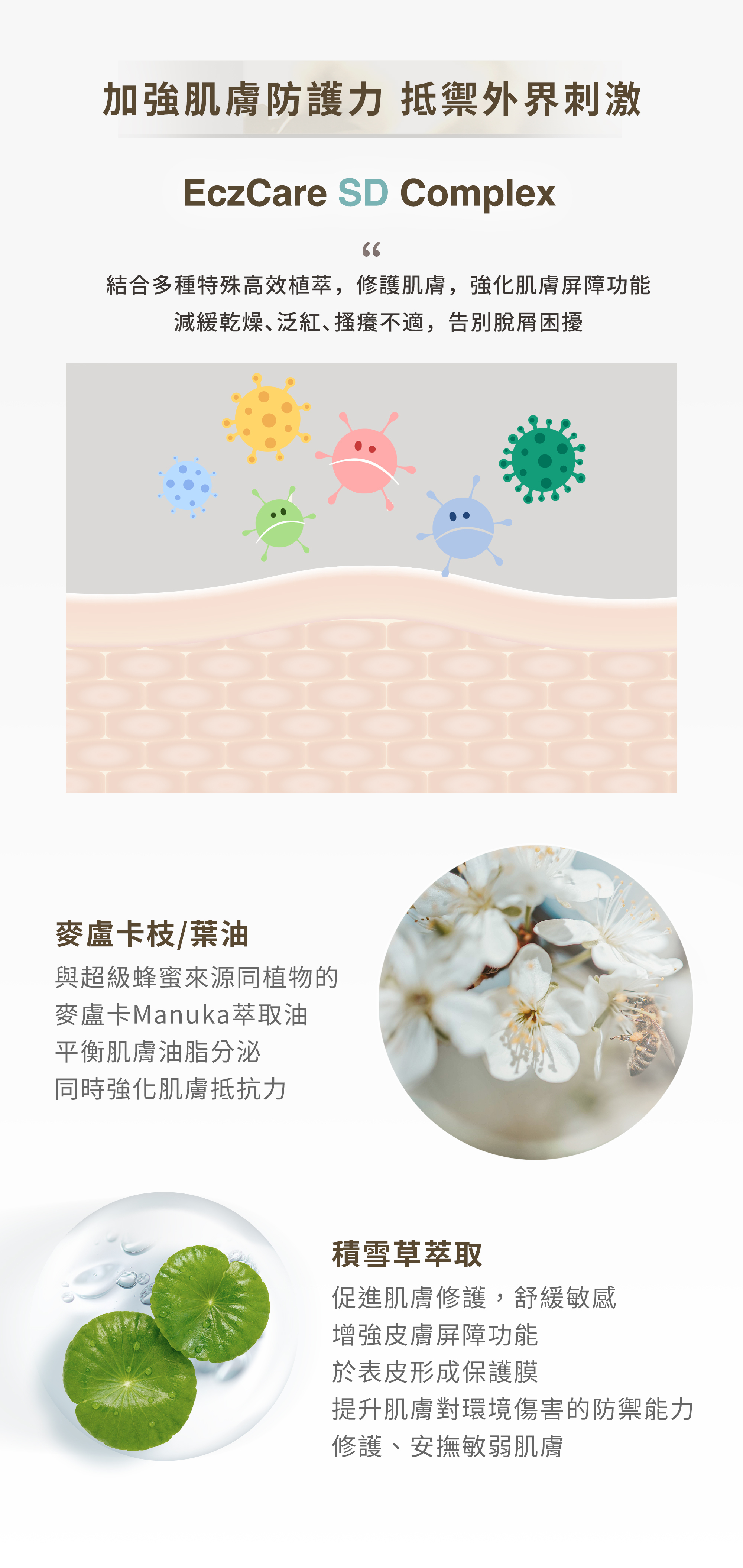 • EczCare SD Complex:結合多種特殊高效植萃,修護肌膚,強化肌膚屏障功能,減緩乾燥、泛紅、搔癢不適,告別脫屑困擾