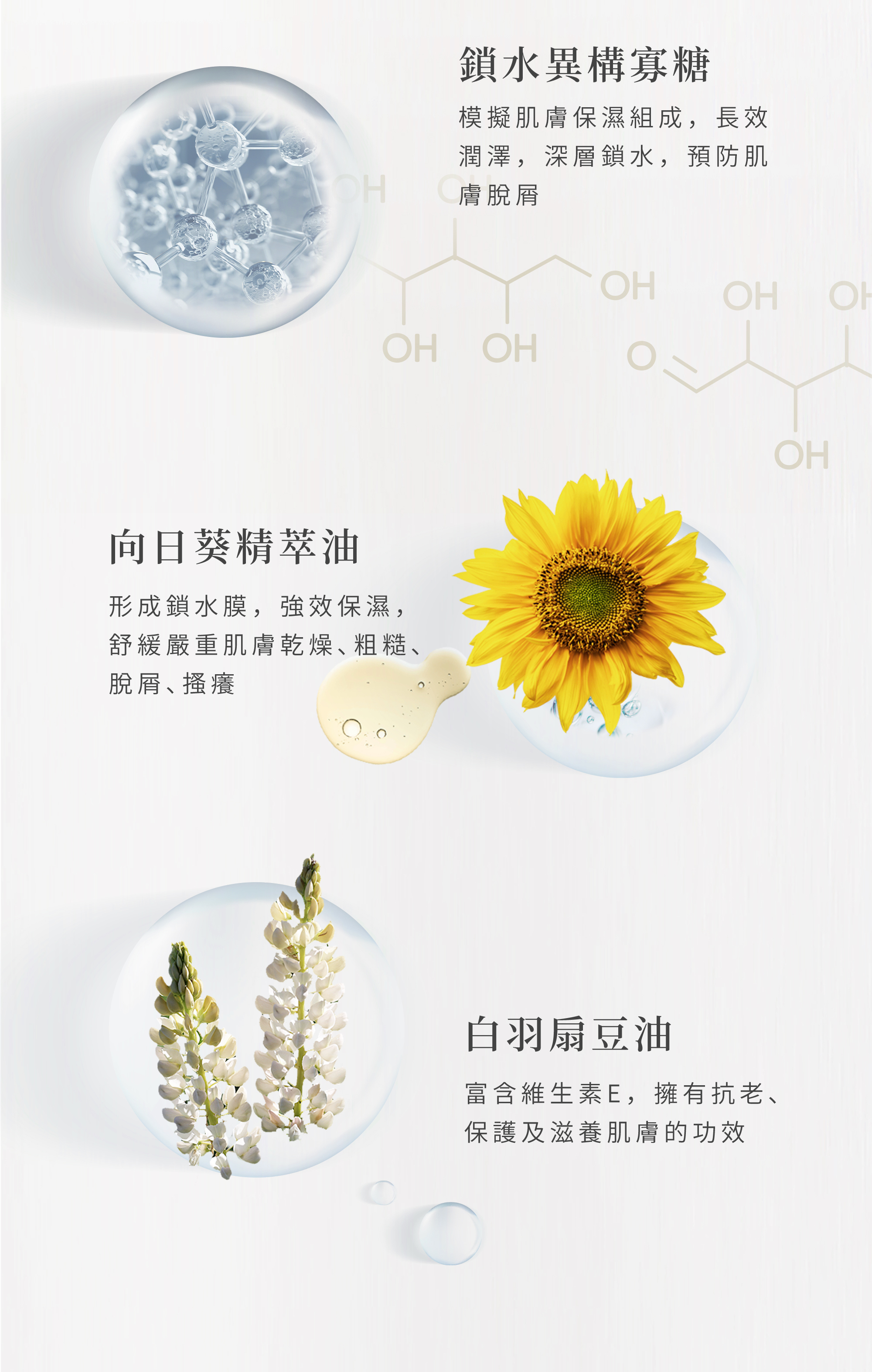 • 向日葵精萃油:形成鎖水膜,強效保濕,舒緩嚴重肌膚乾燥、粗糙、脫屑、搔癢